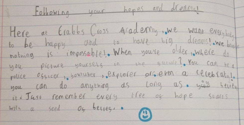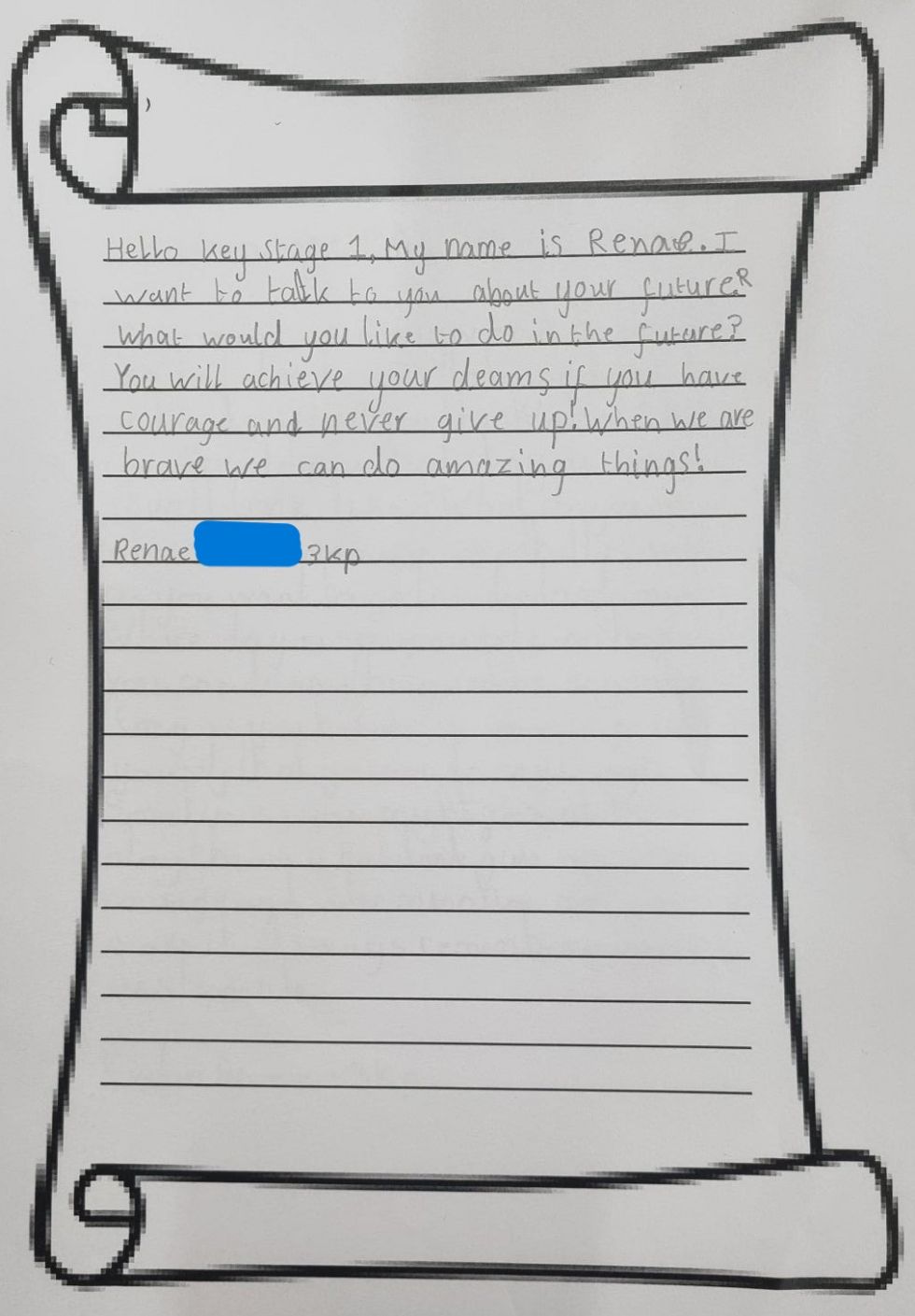 In English, we have been reading 'The Seed of Doubt' and thinking about our own wishes and dreams for the future. As we read more of the story, we thought about what we could do to motivate ourselves and others to not give up on their dreams, especially when faced with challenges. We wrote motivational speeches and leaflets to share with the younger children in school.